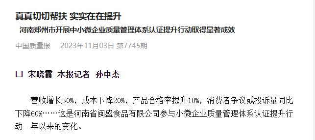 11月3日,《中国质量报》刊发文章《真真切切帮扶 实实在在提升——河南郑州市开展中小微企业质量管理体系认证提升行动取得显著成效》,详细报道了CQM方圆河南公司在助力河南中小微企业质量管理体系提升行动中,对试点企业实施精准帮扶提升的相关情况。