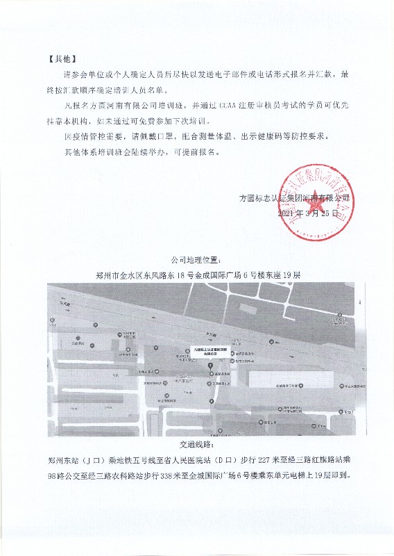 方圆河南公司关于举办国家注册审核员培训班的通知