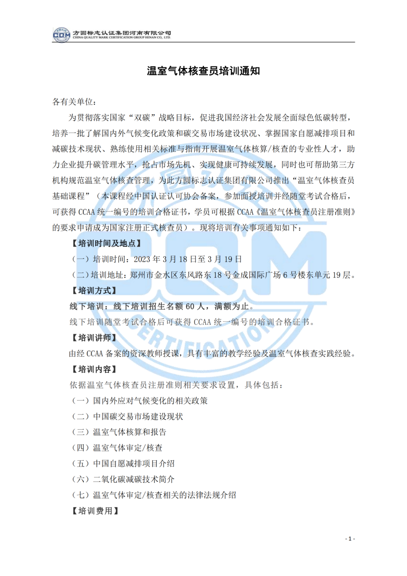 方圆标志认证集团河南有限公司关于举办温室气体核查员培训班的通知