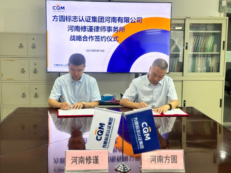 2023年8月18日,在双方充分沟通交流并达成一致意见的基础上,方圆标志认证集团河南有限公司与河南修谨律师事务所举行了战略合作协议签约仪式。方圆河南公司总经理李红培、修谨律所合伙人毛明星分别代表本单位签署合作协议。